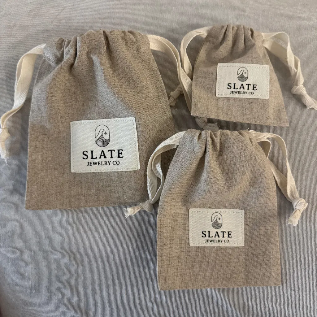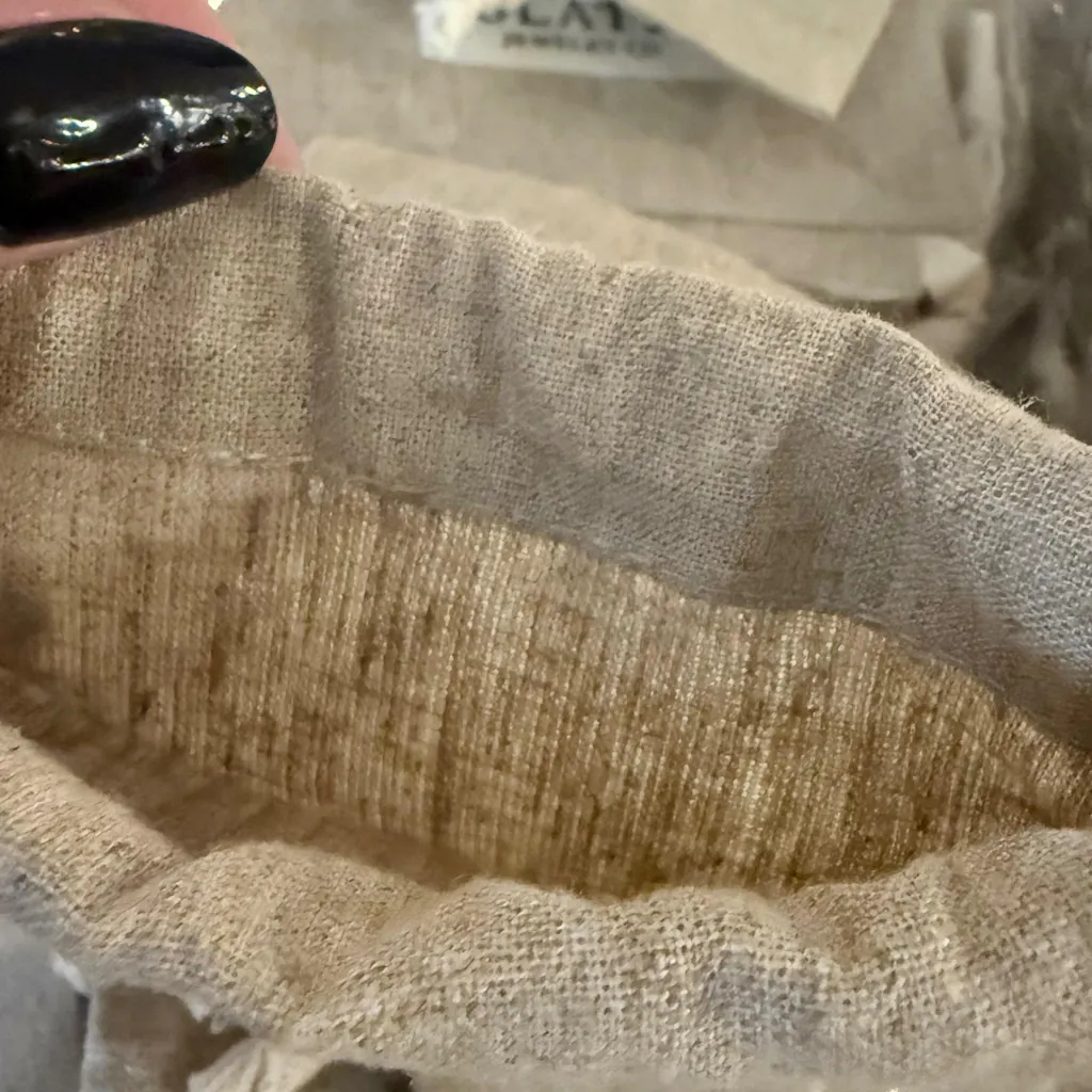 These bags are even better than I expected! They are made really well, and I especially love that the inside tops of the bags are folded and sewn so there aren’t loose stings. I even tried to scratch my logo off a bag to test the prints durability and it didn’t even budge. The color is a great neutral & natural beige and the slight variety in the linen gives it a little character. The material is a nice durable thickness without being too thick & bulky but is in no way thin.